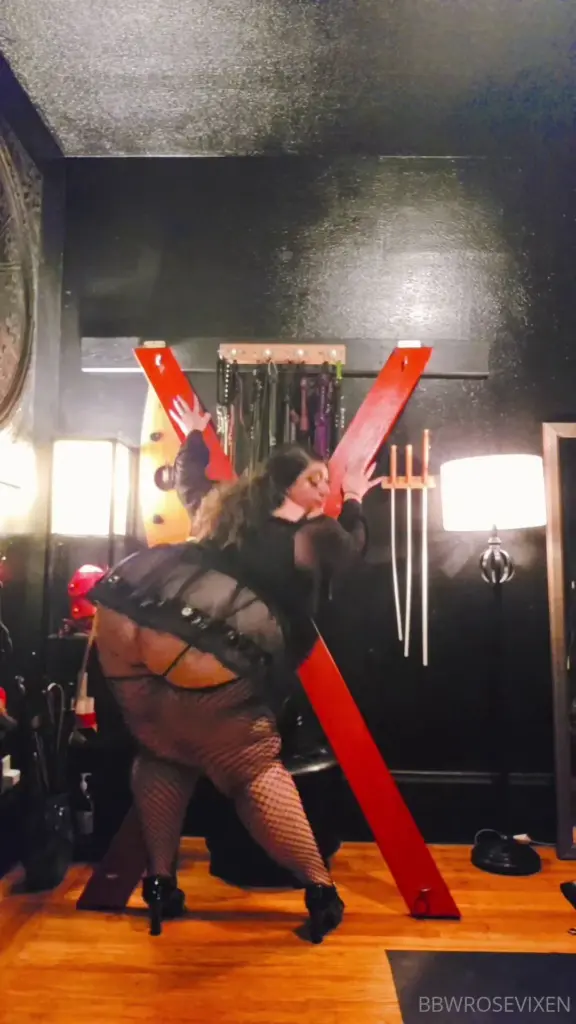 Femme blanche ronde en tenue noire et bas résille joue avec un rouge