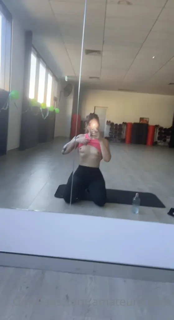 ビデオには、若い白人の女性が茶色の髪を束ね、腕にタトゥーがあり、ジムまたはフィットネススタジオと思われる場所で、鏡の前でひざまずいている様子が映っています。彼女は携帯電話で自撮りしています。部屋にはヨガマットや水のボトルがあり、窓から自然光が差し込んでいます。彼女の体型は引き締まってスリムです。自撮りのポーズで、彼女の体型が強調されています。設定と写真を撮ることに重点が置かれています。