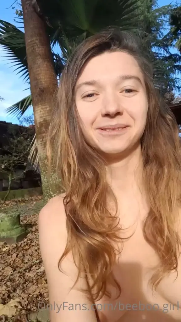 A garota neste vídeo da Beeboo é uma mulher branca na casa dos 20 anos, com cabelos castanhos longos e ondulados e um corpo esbelto. Ela está sem top e sorrindo em um cenário de jardim ou parque com luz natural. O vídeo parece focar em suas ações ao ar livre, com várias cenas fechadas de seu sorriso e risadas. Ela parece estar se divertindo, e a câmera captura sua personalidade despreocupada. O cenário proporciona um cenário único para seus momentos sem top, com folhas, árvores e céu azul visíveis ao fundo. Seus cabelos e pele ficam ótimos na luz natural.