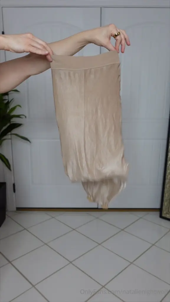 يفتح الفيديو بفتاة شابة نحيفة في العشرينات تقف في ما يبدو أنه حمام أو غرفة غسيل سكنية – باب أبيض على اليسار، أرضية مبلطة، نبات صغير في الزاوية. إنها ترتدي جوارب بيضاء شفافة ولا شيء آخر، تركز بالكامل على عرض نسيج وضيق الجوارب. تتحرك يديها ببطء على طول القماش، وتسحبها قليلاً عند الفخذ وتنعمها، موجهة الانتباه إلى مدى ضيقها ولمعانها على ساقيها. خاتم ذهبي رفيع مرئي على يدها اليمنى طوال الوقت، وهو الزينة الوحيدة التي ترتديها. الإضاءة طبيعية، تأتي من نافذة غير مرئية، مما يعطي المشهد كاملاً طابعًا غير رسمي وغير مُعد. الكاميرا تظل واسعة وثابتة، لا توجد لقطات قريبة على وجهها أو أعضائها التناسلية، فقط عرض مباشر لجسمها في الجوارب، منتقلة الوزن من قدم إلى أخرى أثناء تعديلها. لا يوجد حوار، لا موسيقى، فقط صوت الغرفة المحيطية – ربما سيارة بعيدة أو طيور. تكرر نفس الحركات القليلة عبر إطارات متعددة: سحب، تنعيم، حمل الحافة العلوية حيث تلتقي الجورب بالجلد. الاتساق يشير إلى أن هذا أكثر من عرض منتج من أداء جنسي، على الرغم من أن العري والتركيز على ساقيها يعطيها نغمة لا يمكن إنكارها. جسمها نحيف، مع ثديين صغيرين، وركين ضيقين، وجلد أملس – لا وشم أو علامات مرئية. تتحرك بتعمد، تقريبًا كما لو كانت تعرض شيئًا لشترٍ أو جلسة قياس، ولكن مع شهوانية هادئة في وضعيتها. الخلفية عادية ولكنها مألوفة – باب ممزق قليلاً، وخطوط البلاط ليست نظيفة تمامًا – مما يضيف إلى الأصالة. لا يوجد أشخاص آخرون، لا دفاتر بخلاف النبات والباب. يعتمد وقت التشغيل الكامل على الجوارب، كيف تبدو، كيفية التعامل معها، الطريقة التي تلتصق بها. إنها بسيطة، ولكنها فعالة إذا كنت مهتمًا بلقطات الساق أو الجوارب.
