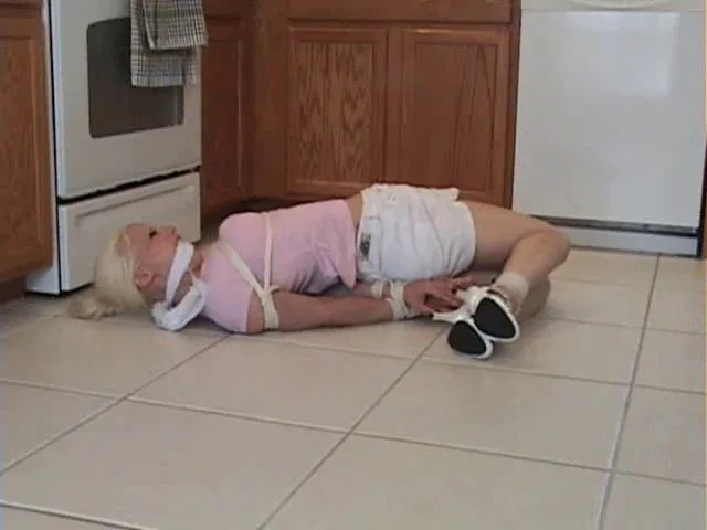 The video opens with a blonde, pierced-nose woman in her 20s sitting on the floor of a kitchen, her hands and feet bound by rope. She’s slim, with a ponytail, and looks like she’s in a pretty vulnerable spot. As the video progresses, she’s moved around the kitchen, sometimes on her knees, sometimes lying down, always bound. The camera captures a lot of close-ups and medium shots, so you get a good look at her and what’s happening. The focus is on her bondage and the kitchen setting, with natural light adding to the realism. There’s no sex act explicitly mentioned, but it’s clear she’s being dominated and restrained.