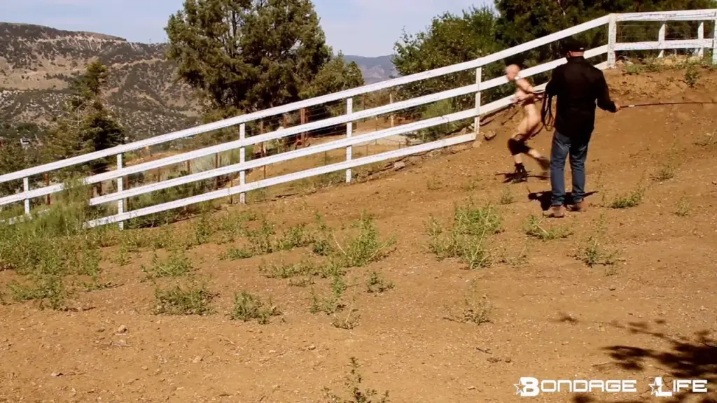 The video starts with a young blonde woman in her 20s, short and slim with a tattoo on her right leg, kneeling on pads, restrained by rope in a rural outdoor setting with a rope fence. A muscular man in his 30s with short dark hair walks up to her, holding the rope. He seems to be enjoying controlling her movements. The woman looks down, seemingly submissive. The outdoor setting adds a natural, wide-shot view of their interaction. There’s no penetration shown initially, just the act of restraint and possibly some teasing.