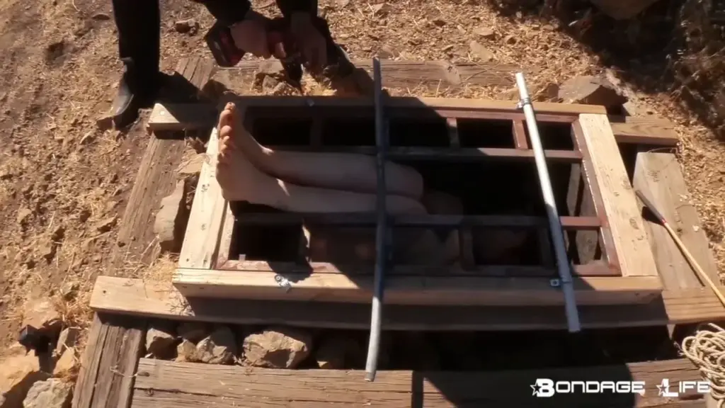 The video starts with an Asian woman, probably in her 20s, crawling on hands and knees outdoors. She’s naked, has black long hair, and tattoos on her thighs. As she moves through the bushes, it’s clear she’s being led somewhere. Then, a man appears, and she’s restrained with rope. He handles her, and it’s pretty intense. The outdoor setting adds to the raw feel of the scene. The woman’s body is quite slim, and her tattoos are noticeable throughout. The man is muscular, and his interaction with her is direct.