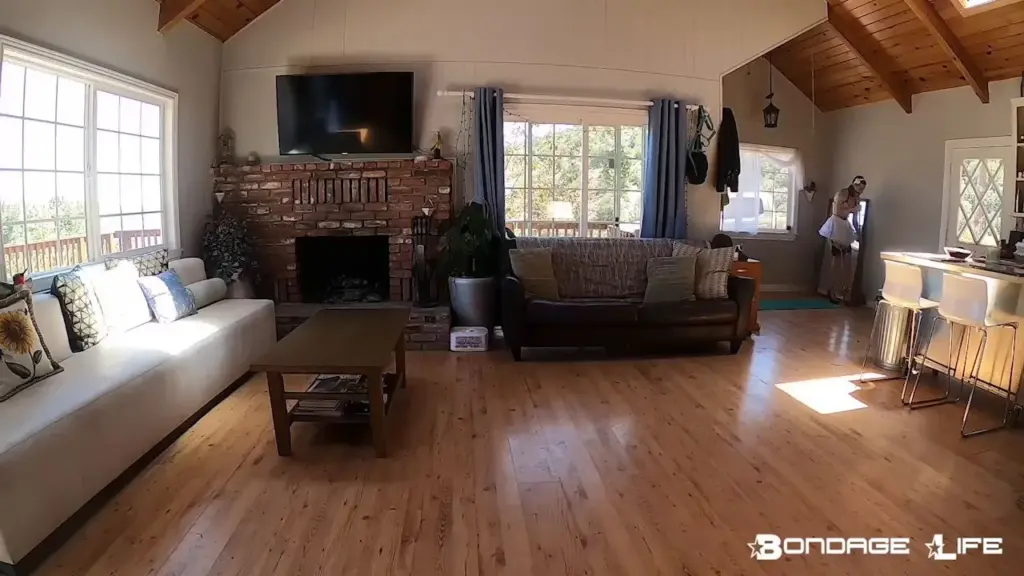 The video starts with a blonde maid in her 20s, short and slim with tattoos, cleaning a living room with a vacuum. She’s wearing a typical maid outfit, which gets taken off quickly. The main action is a bondage fuck with a guy, maid gets bent over and fucked from behind. Her tattoos are noticeable throughout. The camera captures a natural, wide shot of the whole scene, showing off her body and the action. The maid’s expression changes from calm to engaged as the scene progresses.