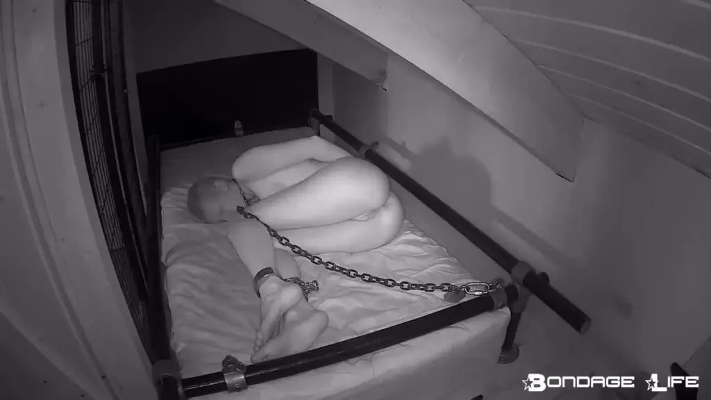 This livecam from Bondagelife features a young, white blonde woman in her 20s with short, slim physique and tattoos. She’s in bondage, chained up in a bedroom setting. The video appears to focus on her quiet, intimate moments. Her hair is blonde and short, framing her face as she moves. The camera captures her from a low, overhead angle, providing a wide shot of her and the bed. The bondage setup is prominent, with chains securing her. The scene maintains a steady, observational pace, letting the viewer take in the details of her predicament.