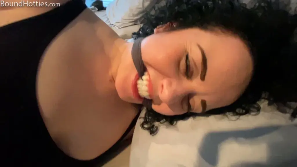 The girl in this Boundhotties video is a curvy Latina with black curly hair and red lipstick. She’s restrained on a bed with handcuffs on her hands and feet. The scene starts with her lying down, then she kneels up, still restrained. She gets gagged at one point. The video focuses on her body and the sex acts she’s performing while restrained. Her curvy figure and expressive face are highlighted throughout. The camera captures a wide shot of her on the bed, emphasizing her movements and the restraints.