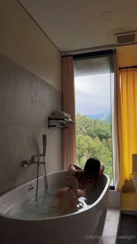 She’s sitting back in the tub, legs stretched out, arms resting on the edges. Water covers her lower body, surface broken by motion around her thighs as she shifts slightly. Her long dark hair is pulled over one shoulder, wet and clinging to her chest just above the waterline. Upper back and shoulders fully visible, skin glistening under soft natural light coming from a window to the side. No movement below the surface, just occasional small shifts in posture — leaning left, then right, adjusting how she sits. The camera holds a static wide shot the entire time, no cuts, no close-ups, no interaction with anything outside the tub. Ambient sound of water and faint room echo are implied by the visual stillness. You see one hand rise slowly to push hair behind her ear, then drop back into the water. That’s it. No nudity below the surface, no explicit acts, just a quiet moment of someone soaking in a bath with daylight shaping the scene.