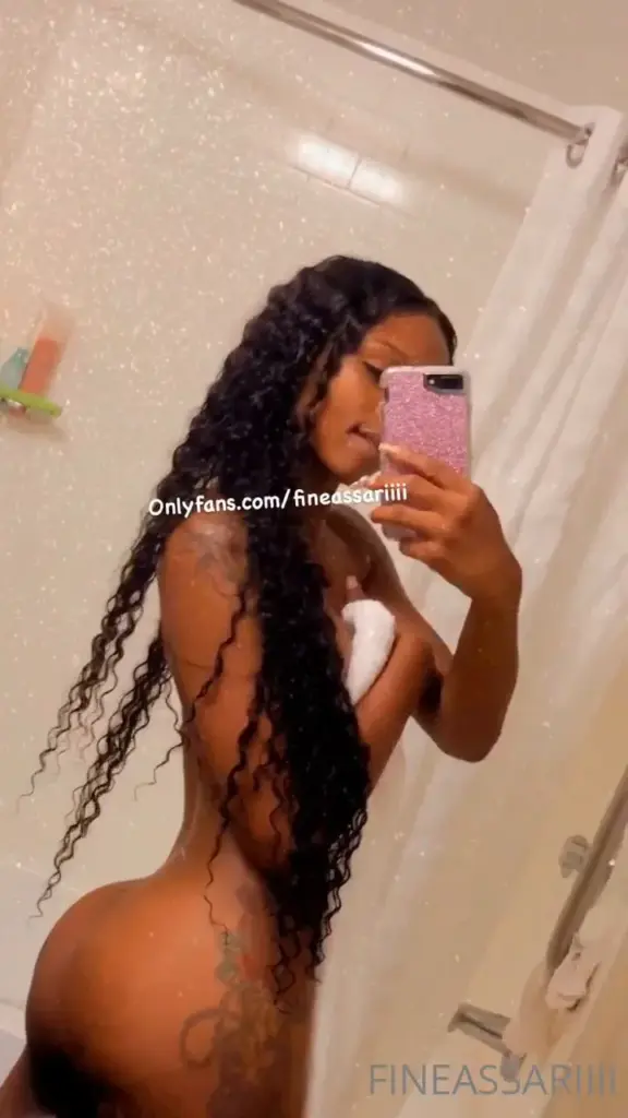 Thick black girl, early 20s, long wavy black hair, full back tattoo, standing nude in front of a bathroom mirror. She’s got a phone in one hand, a towel in the other, just posing — no sex, no partner, just solo nudity. Camera stays on full-body side angles the whole time, natural dim light from a window or overhead. You see her curves, the shape of her ass, how she holds herself — confident but relaxed. The vibe is casual, personal, like she’s filming herself for social media or a private client. Background has a shower curtain, sink, standard bathroom setup — nothing fancy. Five frames total, all similar pose, slight shifts in weight but no movement into any sexual act. Feels voyeuristic, low-key, not staged like a porn shoot. More like leaked content or a model’s private shoot than a studio scene.