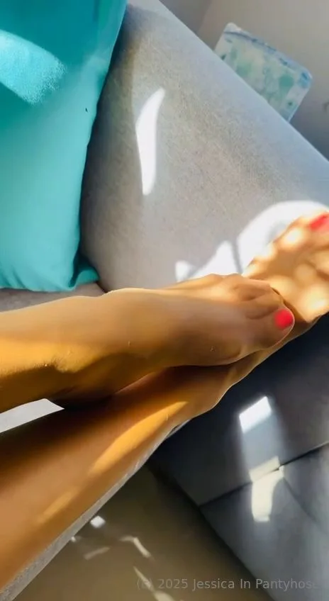 Jessica’s stretched out on a living room couch, wearing sheer pantyhose and white shoes with black bows, legs lifted and bent to show off her feet. The lighting’s natural, coming from a window, giving everything a soft, lazy afternoon vibe. She’s massaging one foot with her hands, painted fingernails visible as she rubs the sole through the nylon — slow, deliberate, borderline therapeutic. Most of the action is leg and foot-focused: crossing and uncrossing her legs, flexing her toes, showing off that red polish in tight close-ups. Camera stays tight during the foot rubs, lingering on texture — the sheen of the hose, the way her skin moves under the fabric. It’s not sexual in a traditional sense, no penetration or explicit acts, but it’s undeniably intimate, built around the quiet fetish of legs, nylon, and attention to detail.