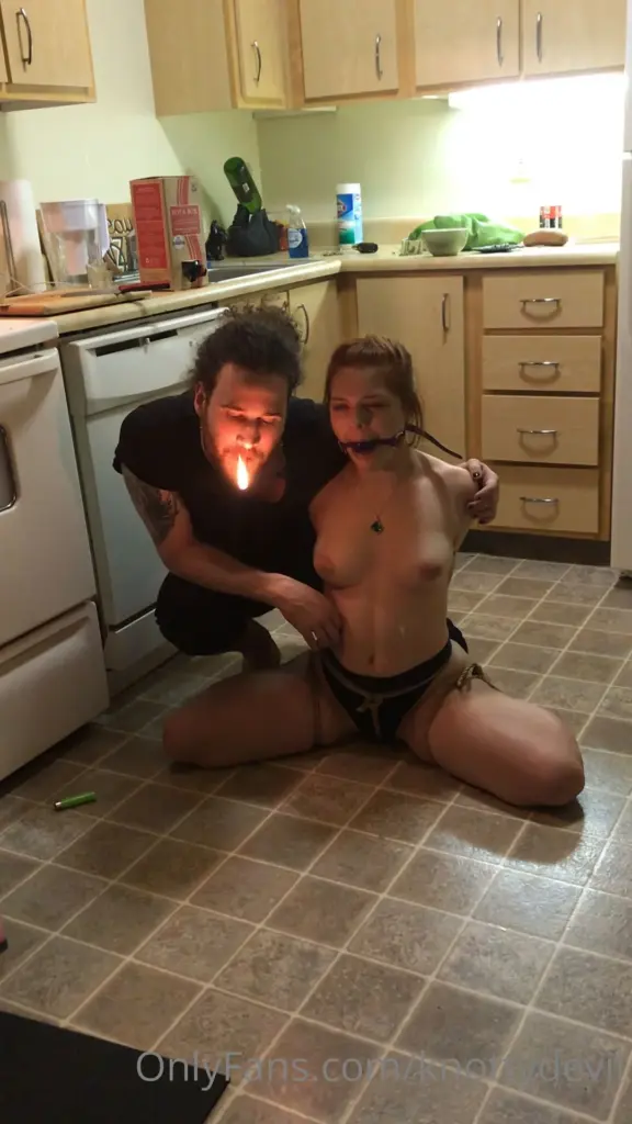 The video starts with a muscular man in his 20s kneeling behind a topless white woman in her 20s with short brown hair in a kitchen. He holds a lit cigarette and touches her stomach. The woman has a tattoo on her arm. The man then picks up a green object. They eventually embrace. The video has a dim and intimate feel with a wide shot. The woman is slim and the man is muscular. The kitchen setting adds to the raw feel of the video.