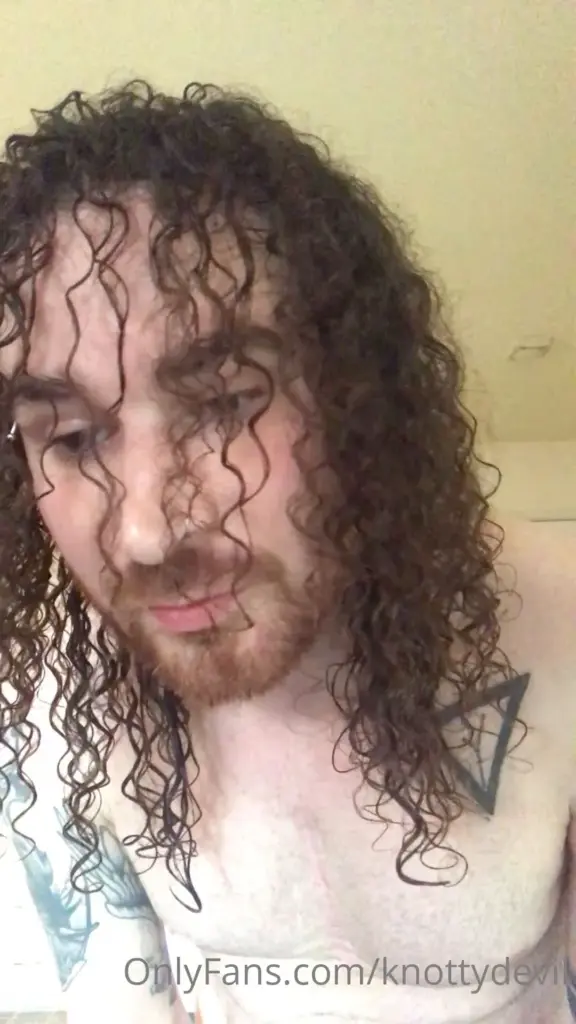 This POV scene from KnottyDevil features a young male performer in his 20s with brown curly hair, tattoos on his chest and arm, and a scar on his chest. He’s shirtless and posing in a bathroom setting, mostly in close-up shots. The scene’s theme is about being taken for ransom, but it focuses on the performer’s physique and expressions. The camera captures his natural look with a towel or shower in the background. The performance is straightforward with an emphasis on the performer’s appearance and the POV perspective.