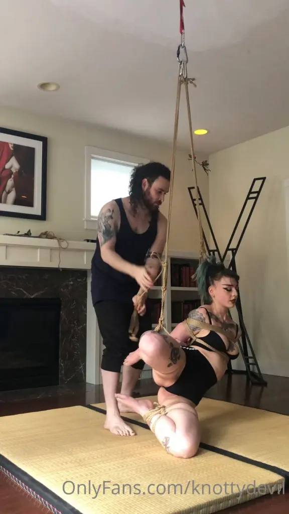 This video from KnottyDevil features a partial suspension sequence. The woman, a petite, tattooed girl with blue/green eyes and long brown hair, is kneeling on a mat with her arms and legs bound by ropes. Her partner, a muscular guy, is standing behind her, tying and adjusting the ropes. As the video progresses, the woman is suspended slightly off the ground, with her partner holding onto the ropes. The scene takes place in a cozy living room with a fireplace and bookshelf in the background. The camera captures the intimate moment in a wide shot. The video showcases knot-tying and bondage play.