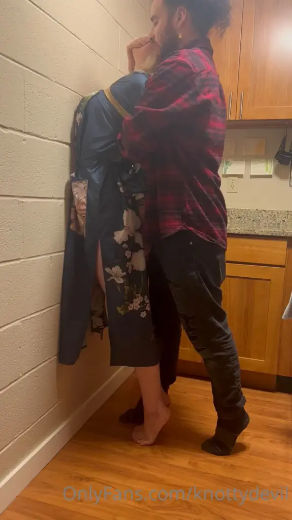 The scene starts with adorgeous, a blonde woman, being tied up in lingerie by knottydevil. She’s wearing a sexy outfit that showcases her slim body and long blonde hair. The man is very dominant, restraining her and performing various forms of intimate play. The setting looks like a home environment, possibly a kitchen or living room, with wooden cabinets and granite countertops in the background. The camera captures the action in a natural and intimate way, making you feel like you’re right there with them. adorgeous seems to enjoy the experience, reacting with pleasure to the man’s touch.