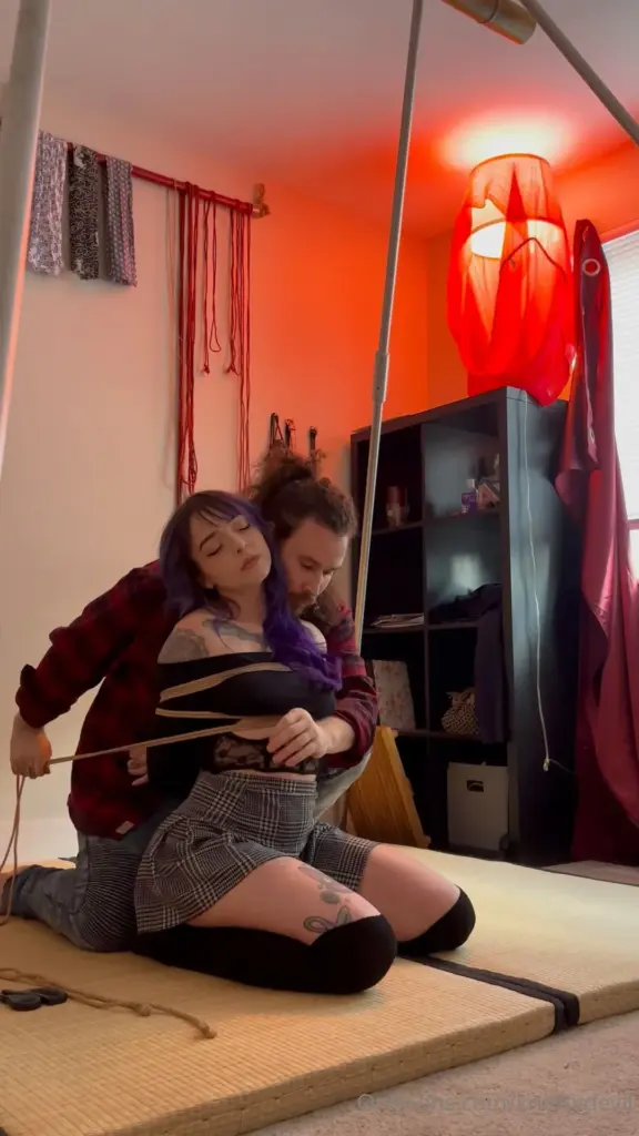 The scene features a muscular man in his 20s with a woman who has tattoos on her arms and thighs, also in her 20s. She’s a brunette with a messy bun and purple hair, looking quite petite. The man is tying her arms with rope in a dimly lit bedroom with a red lamp. The atmosphere is intimate, with a medium shot capturing their actions. He holds her in an embrace and ties her up, then has her sit on the floor with him behind her, holding her. The rope bondage is a significant part of the scene, adding to the intensity of their interaction. The woman’s tattoos are noticeable throughout, adding to her allure.