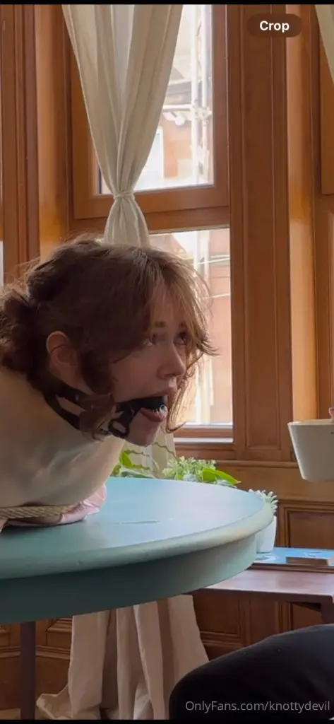 This video features a travelling scene from knottydevil, 21 minutes long. It stars two females and one male, all in their 20s and 30s. One female has medium length brown hair, is petite, and has blonde highlights. The other female has short brown hair. The male has a short beard. They engage in oral sex, with one female performing a blowjob while the other is bondaged with a gag and cup. The setting is an indoor living room with a table. The camera captures close-up and medium shots, mostly in side profile. The blonde female’s petite frame and the way the male’s beard scratches her face during oral sex are notable. The brown-haired female’s bondage and gagging add to the intensity. The video showcases a mix of natural and staged moments.