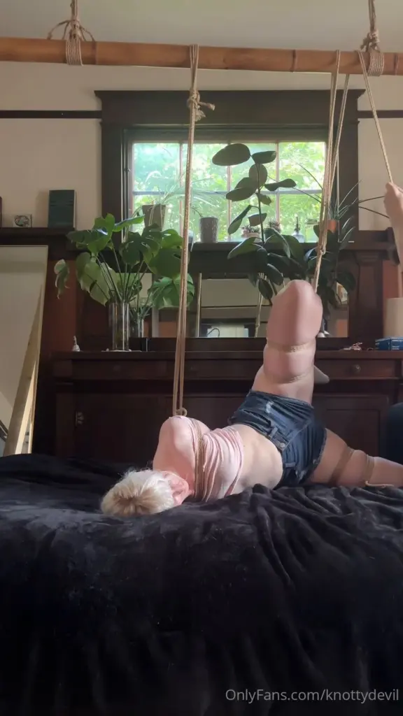 The scene starts with a blonde girl in her 20s being restrained with ropes, her hands and feet bound. She’s lying on her stomach on a bed in a bedroom with natural light coming in from a window. A muscular black guy in his 20s with a tattoo on his arm is tying her up. The girl is suspended in the air, her legs and arms bound by ropes. The guy fucks her while she’s tied up, and she looks like she’s enjoying the sensation. The camera captures the action in a wide shot, showing off the girl’s short blonde hair and the guy’s muscular physique. The scene has a sensual flow to it, with a focus on the girl’s restrained movements and the guy’s dominant position.