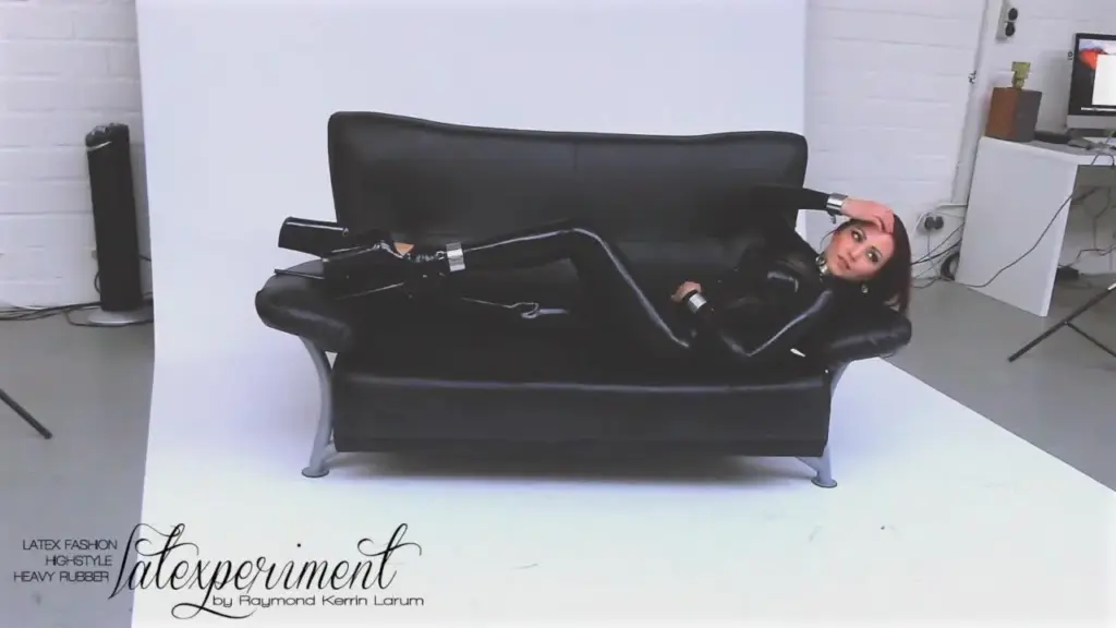 The video features Jasmine Bennett, a 20-something white girl with dark long hair, tattoos, and a slim build. She’s wearing high heels and gets fucked on a black leather couch in a studio setting. The camera captures her from various angles, showcasing her legs up in the air, hanging off the couch, and over the backrest. The dude is not visible but the sex acts are intense. Jasmine takes it well, handling different positions like lying down with legs stretched out and sitting with legs over the backrest. Her tattoos and heels are noticeable throughout. The studio lighting and white backdrop make the scene look professional.