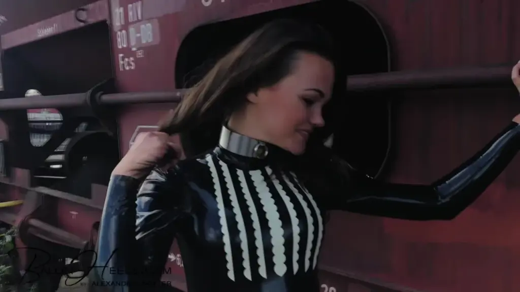 The girl in this LateXperient scene is a brunette with long, slim hair, wearing a black and white latex dress. She’s posed in various angles, showcasing her tattoos. The scene focuses on her flexibility and posing, with no specific sex acts shown but lots of teasing. Her body type is definitely on the slender side, making the latex dress look sleek on her. The outdoor train yard setting provides a unique backdrop for her to show off. The natural lighting highlights her curves and the latex material.