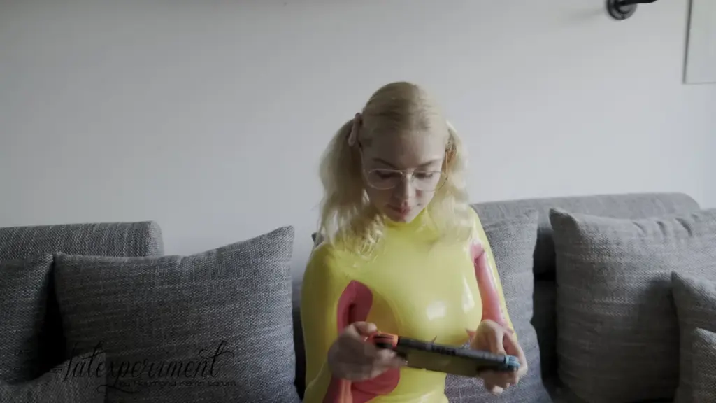 The scene features Phoebe Patrick, a blonde woman in her 20s with a slim build and glasses. She’s seen in various positions, including kneeling on a couch in high heels, holding a teddy bear, and lying down. The setting is a living room with natural light coming in through a window. The video focuses on her expressions and body language as she engages in solo play. Her blonde hair is styled in a ponytail, and she has a petite frame. The camera captures her from different angles, providing a detailed view of her actions.