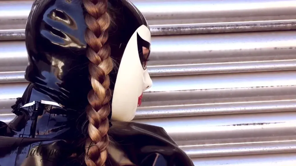 This one’s got a girl named Hermione Jones, dressed in a slim latex outfit, posing outside in an alleyway or parking garage. She’s got brown braids and is wearing a white mask with red lips and black eye makeup. The outdoor setting’s pretty cool, with a garage door and brick sidewalk in the background. She starts off just posing, showing off that latex outfit, but then things get more interesting. Unfortunately, I don’t get a blowjob or any hardcore action, just some teasing and posing. The camera captures her from different angles, highlighting that outfit and her expressions.