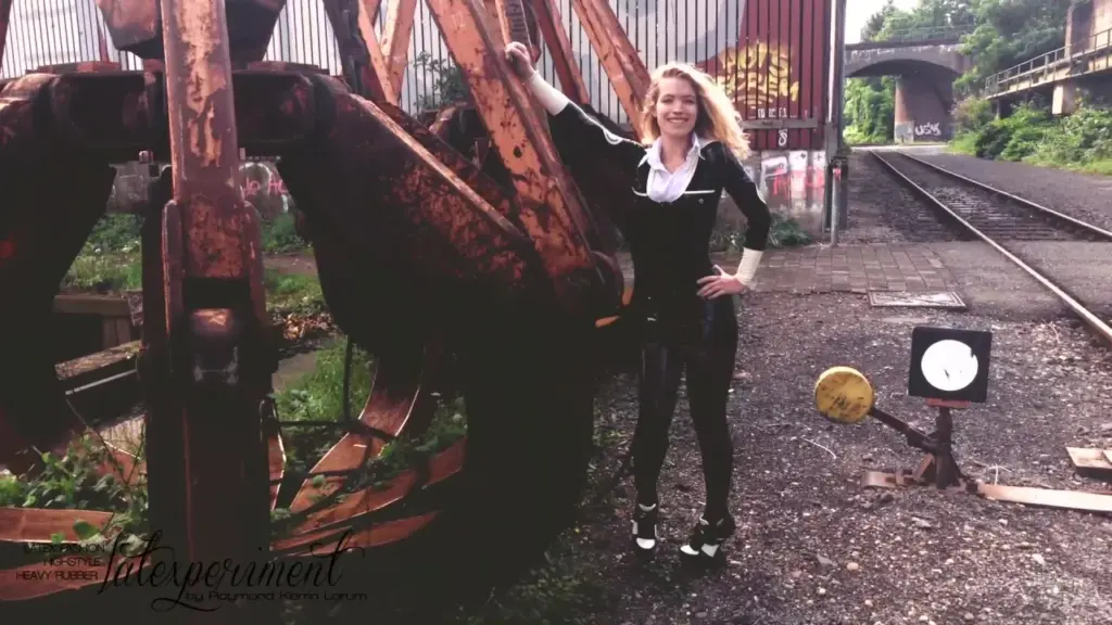 The video features a blonde girl, presumably in her 20s, with long and wavy hair, wearing a white collar and a black dress. She’s posing in various locations within an abandoned industrial area with train tracks and graffiti. The setting provides a gritty backdrop for the action. At some point, she seems to be engaging in sexual activities, although the specifics are somewhat obscured. Her appearance, particularly her slim build and the way her hair flows, is quite captivating. The industrial setting adds an edgy feel to the scene. The girl’s expressions and body language suggest she’s into what’s happening. The camera captures her from different angles, showcasing her movements and reactions.