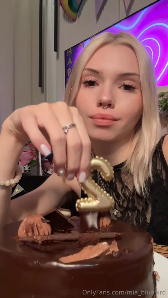 Mia Bluebird’s the only girl in this scene, but she’s putting on a full solo-to-cam show like it’s a private session. She starts off blowing into a gold zero balloon with a chocolate cake in front of her, purple backdrop bright and party-like, then shifts into stripping down — fully naked by the time she’s grinding on an invisible partner. The fake blowjob comes next, exaggerated lip movements as she strokes an invisible cock, then she flips to doggy on the couch, bouncing hard like someone’s actually fucking her. You never see a dick, but she acts out the whole thing — gasping, moaning, slamming her ass back, even “finishes” with a cumshot simulation where she spreads cum across her tits and face. Her septum ring and heavy makeup stay sharp the whole time, no smudging, and those blue eyes stay locked on the camera like she’s making it personal. The whole thing’s clearly shot for paying subs — intimate lighting, medium close-ups, zero cuts — feels like you’re right there on the couch with her.