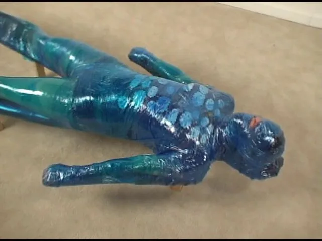 The video starts with a muscular guy in his 30s wrapped in blue plastic lying down on a beige carpet with wooden supports under his body. The camera zooms in and out, capturing his body in a natural, wide shot. It appears to be some form of fetish or BDSM scene, focusing on the plastic wrapping. The guy seems to be in a submissive position, but there’s no clear indication of sexual activity at the beginning. As the video progresses, the focus remains on the guy’s body wrapped in plastic, with no clear sex acts shown but a lot of emphasis on the wrapping and the guy’s physique. The production quality is high, with clear images and a steady camera. The scene is set indoors with a simple, natural setup.