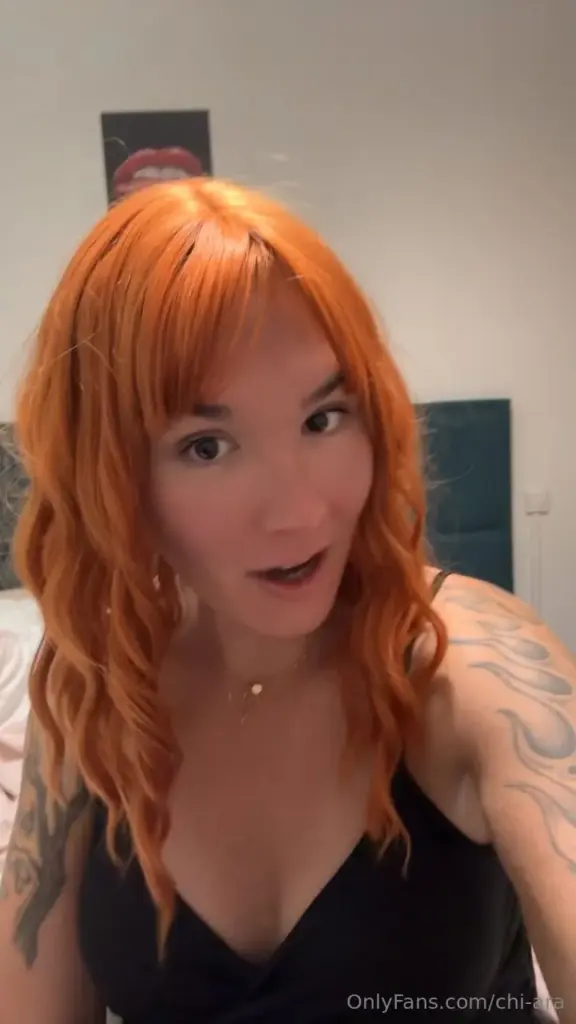 She’s sitting on the edge of the bed, wearing a simple top, orange wavy hair falling just past her shoulders, those slim tattoos visible on her arms as she moves. Her bangs are cut straight across, and she’s wearing a small heart-shaped necklace that bounces slightly when she leans forward. The lighting is soft, natural — looks like late afternoon sun coming through a nearby window, casting a calm glow over the white sheets and black leather bag resting on the side. She smiles at the camera, then opens her mouth slightly, not in a fake way, more like she’s actually reacting to something off-screen. The shots stay medium, framed slightly above, keeping her torso and face in clear view the whole time. No nudity, no sex — just her sitting there, shifting positions, sometimes looking down, sometimes meeting the lens dead-on with a neutral expression. You can tell she’s not performing for a porn scene, more like a tease or promo clip — casual, low-key, but focused. The black leather bag in the background adds a minor detail, maybe hinting at a travel vibe, but nothing’s confirmed. She’s petite, maybe early 20s, lean build, and the heart pendant stands out against her chest with every small motion. The video keeps it simple — no cuts to other angles, no extra people, just her in the bedroom the entire time. Her mouth opens a few times like she’s about to speak, but no audio cues suggest she does. The whole thing feels unrehearsed, the kind of clip someone might post privately before going live or starting a stream.