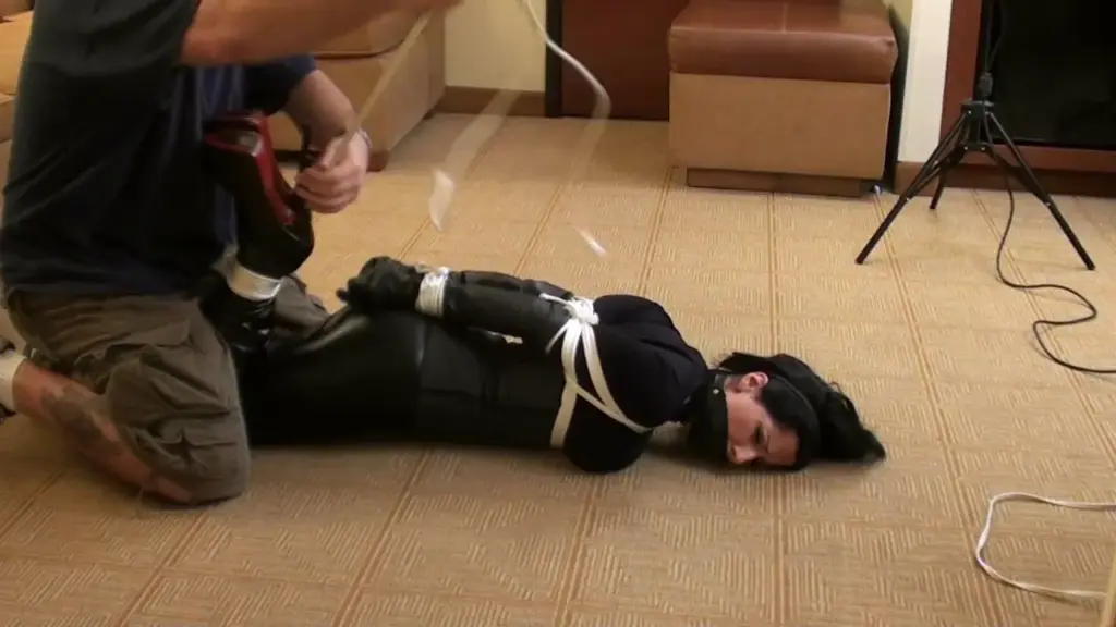 The video starts with a young Asian woman, likely in her 20s, kneeling on a couch with her arms and legs bound in a black latex outfit. She’s got long, slim, black hair and looks pretty petite. A guy, probably in his 30s with a tattoo on his arm, walks in and starts adjusting her bondage. He then proceeds to fuck her while she’s hogtied, occasionally checking on her. The camera captures everything in a natural, wide shot, giving a clear view of their actions. The woman’s body type and the way she’s restrained make for an interesting dynamic. The guy’s not doing much talking, just focusing on the act. At some point, another woman appears to be present but not directly involved in the sex acts.