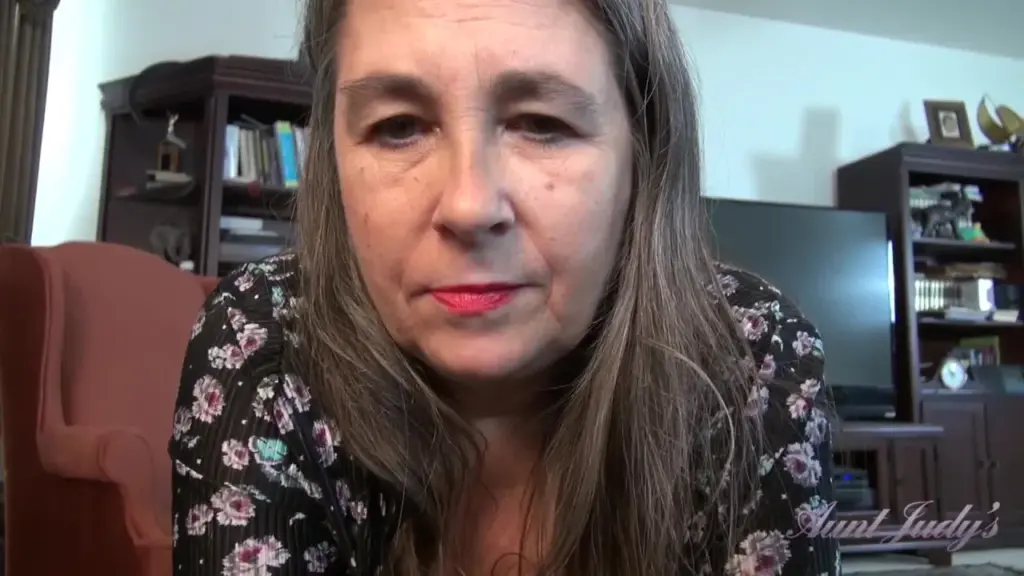 The video features a mature brunette woman with long brown hair and average pubic hair. She’s sitting in a living room with a bookshelf, armchair, and TV in the background. She talks to the camera, occasionally exposing her pubic area. The close-up shots of her pubic hair are quite natural. The medium shots of her talking to the camera seem artificial, possibly due to the studio lighting. The woman’s body type appears to be average, not particularly slim or curvy.