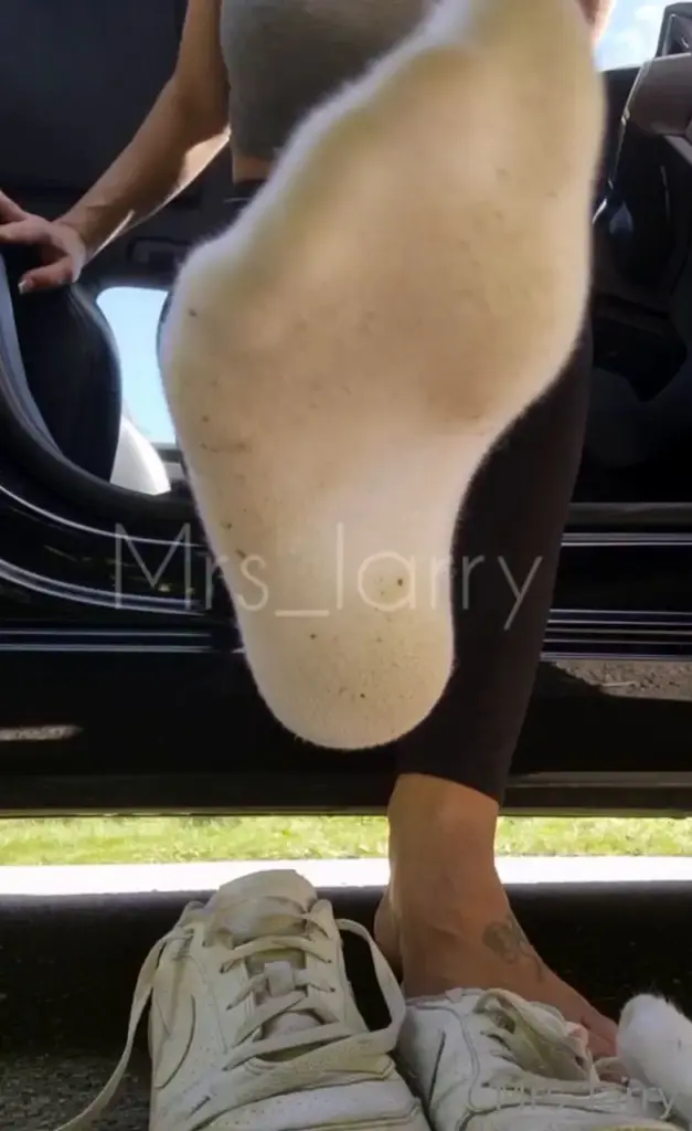 视频以一位年轻金发女孩的脚踝特写开始,她在车外脱鞋。她脚踝上有一条修长的纹身。然后她展示她的脏袜子,最终脱掉袜子,露出赤足。整个过程,镜头始终聚焦在她的脚部,捕捉自然的户外光线。她有一头长而金黄的头发,明显是在二十多岁。简洁的场景和对脚部的聚焦,提供了一个有趣的近距离视角。